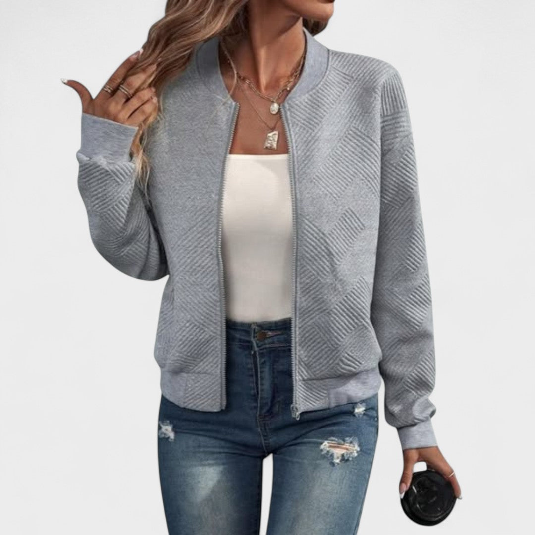 Bomber Dora donosi suvremeni štih bezvremenskom klasiku. Sa suptilnim geometrijskim uzorkom, praktičnim zatvaranjem i rebrastim manšetama za savršeno pristajanje, lagana je i idealna za kombiniranje s bilo kojim stylingom – od traperica do haljina – u svako doba godine.