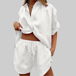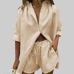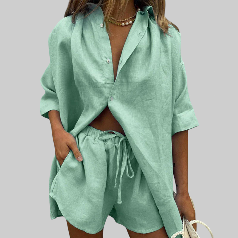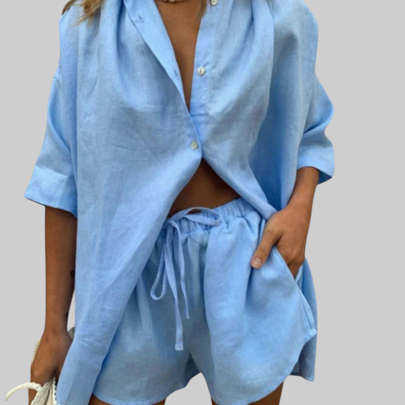 Vanessa dvodijelni set predivno spaja lakoću i eleganciju. Zahvaljujući mekanom materijalu i opuštenom kroju, savršeno je rješenje za toplije dane, kada udobnost i stil idu ruku pod ruku – idealan za odmor, kavice i opuštene šetnje.