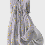 Ova šarmantna duga haljina u nježnoj lila boji savršen je izbor za svjež i proljetni izgled. Njezin decentan dizajn s bijelim i žutim tratinčicama odiše laganošću i veseljem, dok remen u struku pruža savršeno pristajanje.