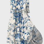 Ova prekrasna duga haljina s bijelom podlogom i plavim cvjetnim uzorkom odiše svježinom i elegancijom. Njezin lagani dizajn donosi dašak romantike, dok pojas u struku prirodno i ženstveno naglašava siluetu.