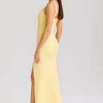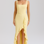 BELA | Elegantna satenska korzet haljina dizajnirana je kako bi istaknula siluetu i dodala šarm svakom koraku. U nježnoj pastelno žutoj boji s volanastim rubom, spaja klasičnu eleganciju s razigranim i nježnim prizvukom. Idealna za proljetne zabave, vjenčanja ili događanja na otvorenom, ova haljina obećava biti savršen izbor za posebne prilike, bilo danju ili noću.
