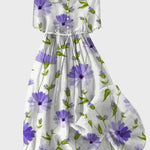 Ova elegantna maksi haljina, bijele podloge s ljubičastim cvjetovima, odiše svježinom i ženstvenošću. Lagana tkanina i ležeran kroj čine je savršenim izborom za proljetne i ljetne kombinacije.