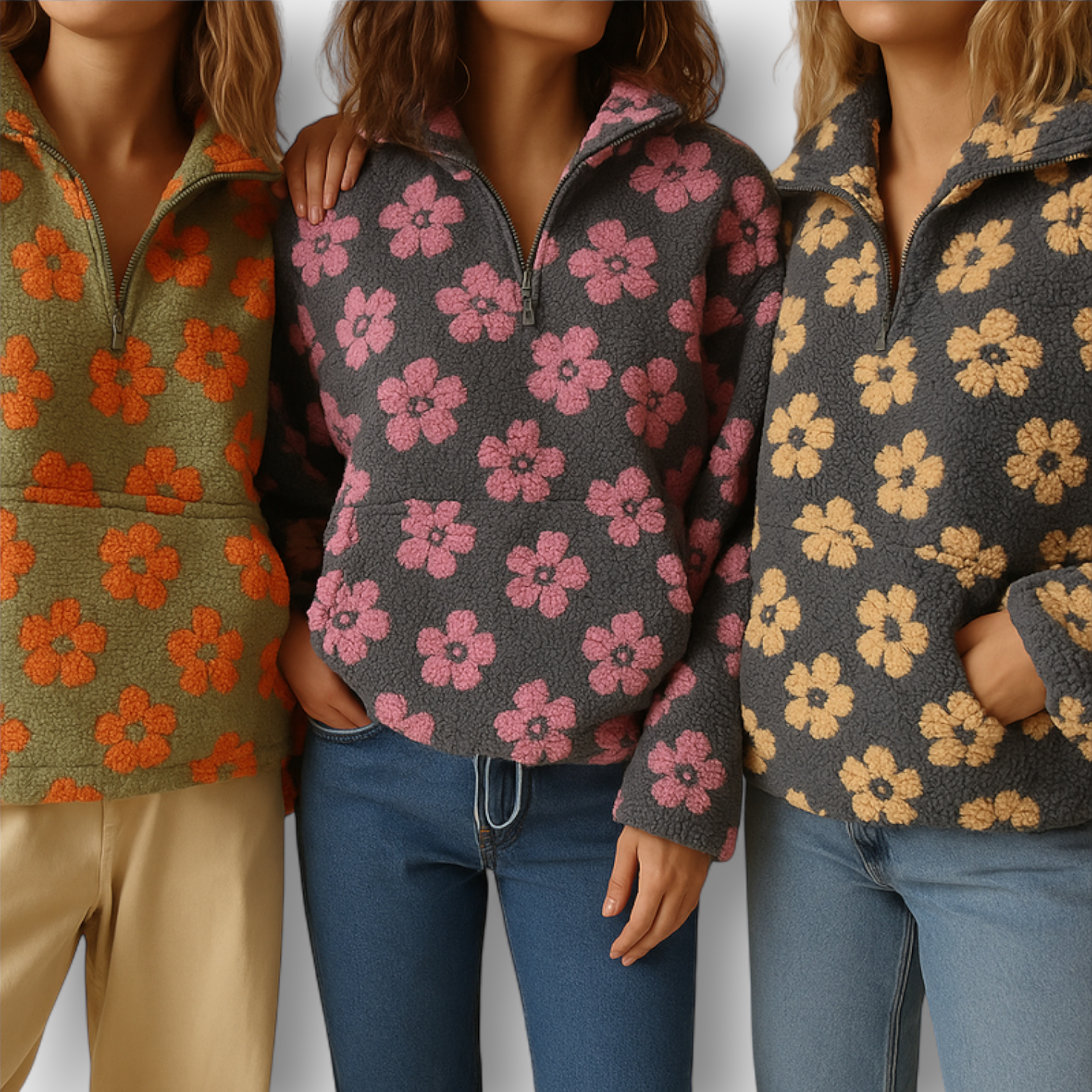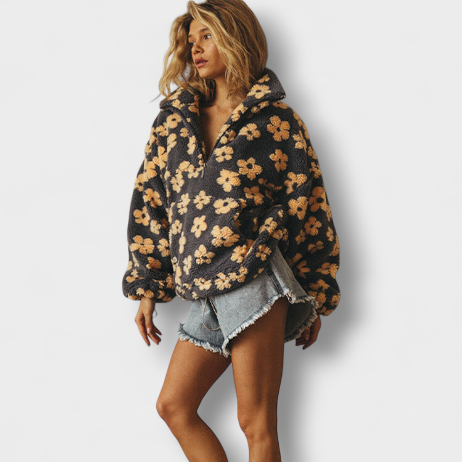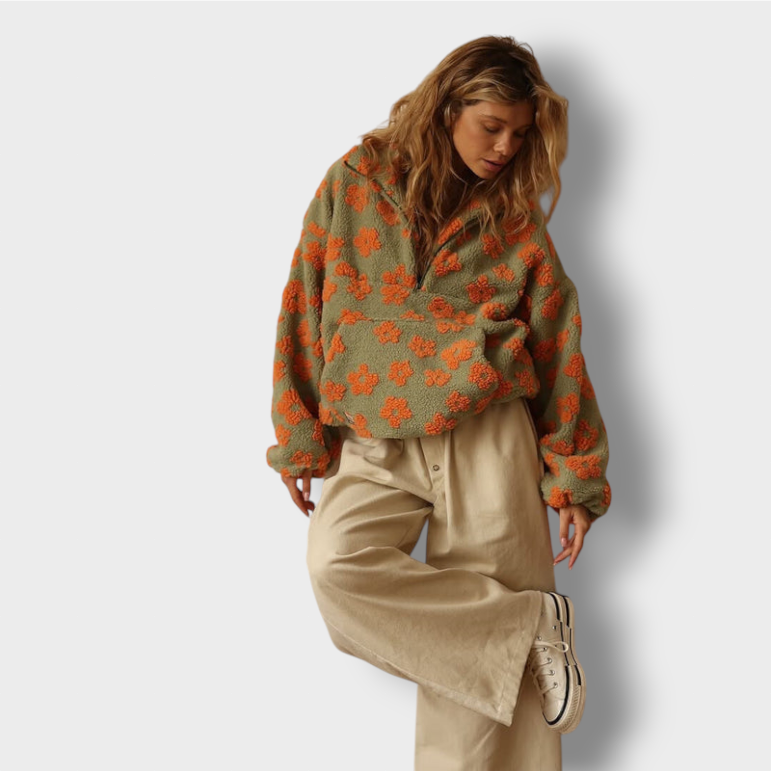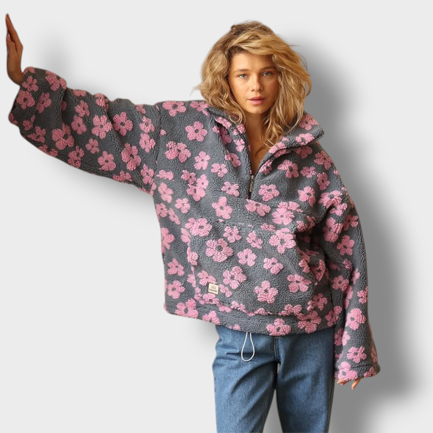 Uživajte u apsolutnoj udobnosti s ovim ultra mekanim sherpa puloverom, ugodnim poput toplog zagrljaja. Cvjetni uzorak inspiriran boho stilom daje originalan izgled, dok blago oversized kroj jamči opušten i moderan stil.